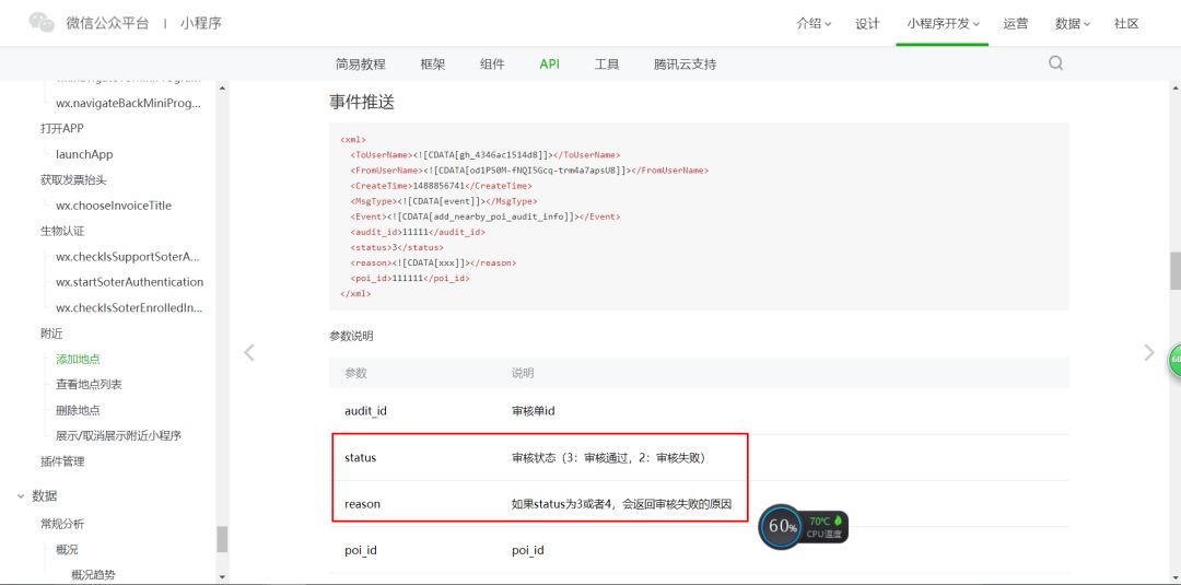 开发附近地点那块逻辑,发现审核时间过长,这样很影响测试效率和进度,希望官方能加快审核。而且楼主问的这块,api文档确实说的前后矛盾了,也麻烦尽快更新文档。