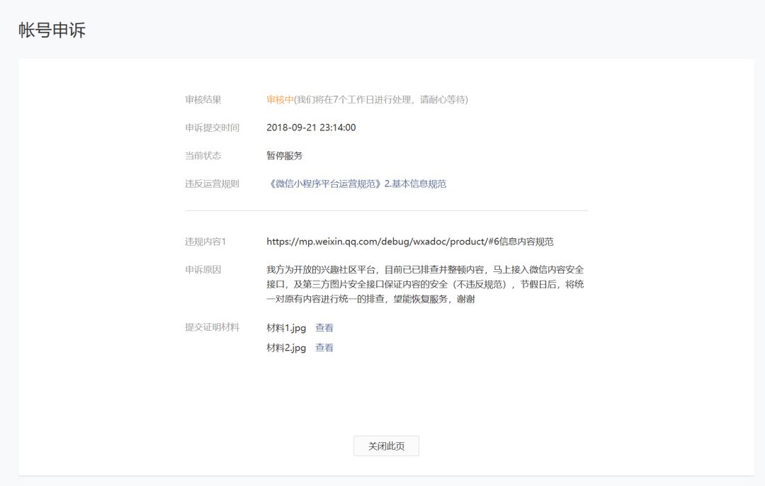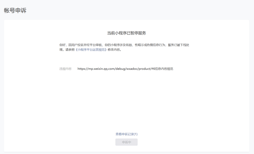 强制暂停原因:我方为兴趣社区UGC平台,因平台监管失当,排查做的不够仔细,且尚未接入微信提供的内容安全接口,被不法分子钻了空子,发布了低俗内容后,没有及时将之删除封禁,故而导致被投诉后强制暂停整改。申诉原因:目前我方已全面排查并整顿内容,已经接入微信内容安全接口,及第三方图片安全接口。并安排两名内容风控专员实时排查监控,用户UGC内容是否涉及违规违法。在新版本中,显著增加了用户举报按钮。主动联系了杭州当地网警网监,共同配合警方打击违法违规内容。截止今日(9月27日),已整整被暂停服务六日,望能尽快恢复我方小程序服务。代兴趣星球万名正常经营兴趣社区的运营主深表谢意