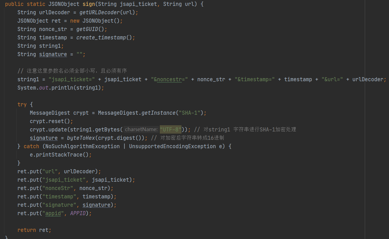 string1 = "jsapi_ticket=" + jsapi_ticket + "&noncestr=" + nonce_str + "×tamp=" + timestamp + "&url=" + urlDecoder;