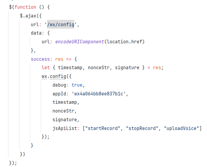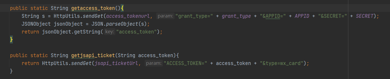 public static String getaccess_token(){String s = HttpUtils.sendGet(access_tokenurl, "grant_type=" + grant_type + "&APPID=" + APPID + "&SECRET=" + SECRET);JSONObject jsonObject = JSON.parseObject(s);return jsonObject.getString("access_token");}public static String getjsapi_ticket(String access_token){return HttpUtils.sendGet(jsapi_ticketUrl, "ACCESS_TOKEN=" + access_token + "&type=wx_card");}public static JSONObject sign(String jsapi_ticket, String url) {String urlDecoder = getURLDecoder(url);JSONObject ret = new JSONObject();String nonce_str = getGUID();String timestamp = create_timestamp();String string1;String signature = "";// 注意这里参数名必须全部小写,且必须有序string1 = "jsapi_ticket=" + jsapi_ticket + "&noncestr=" + nonce_str + "×tamp=" + timestamp + "&url=" + urlDecoder;System.out.println(string1);try {