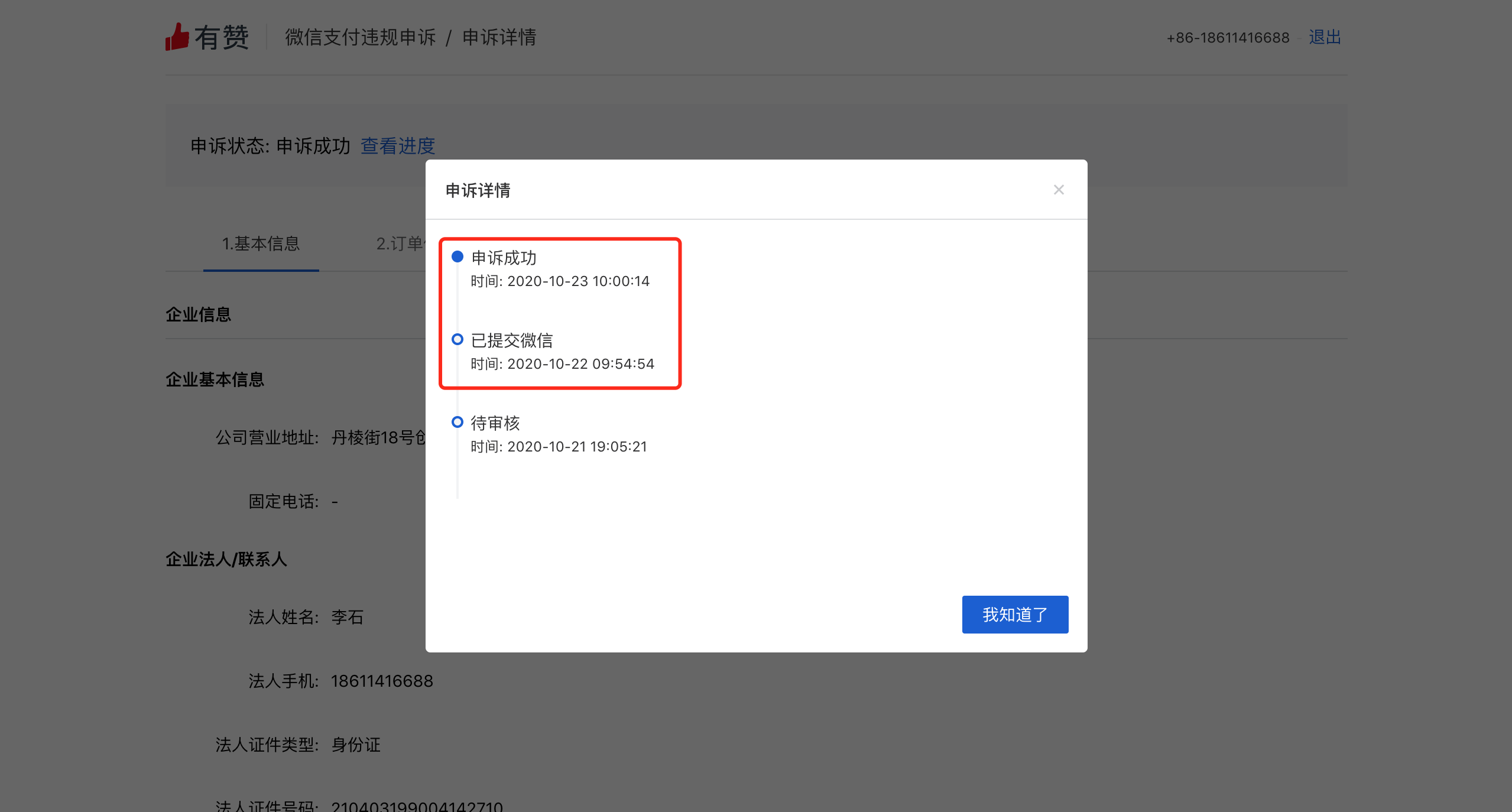 在2020-10-23 10:00:14提示「申诉成功」。