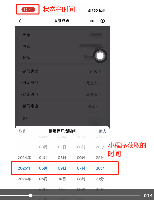 进去页面会获取当前时间。用户系统时间是正常的(录屏状态栏显示也是对的),但是小程序获取到的时间有问题,少了八个小时。
