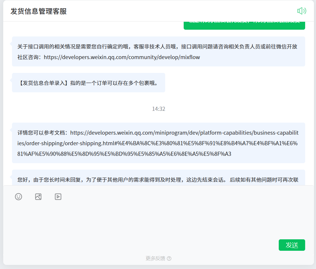 商家可在该路径进行咨询下哈,路径:小程序管理后台https://mp.weixin.qq.com/ 支付与交易-订单管理-发货信息录入/订单信息录入-【实物电商类小程序】旁边的问号-平台客服咨询。