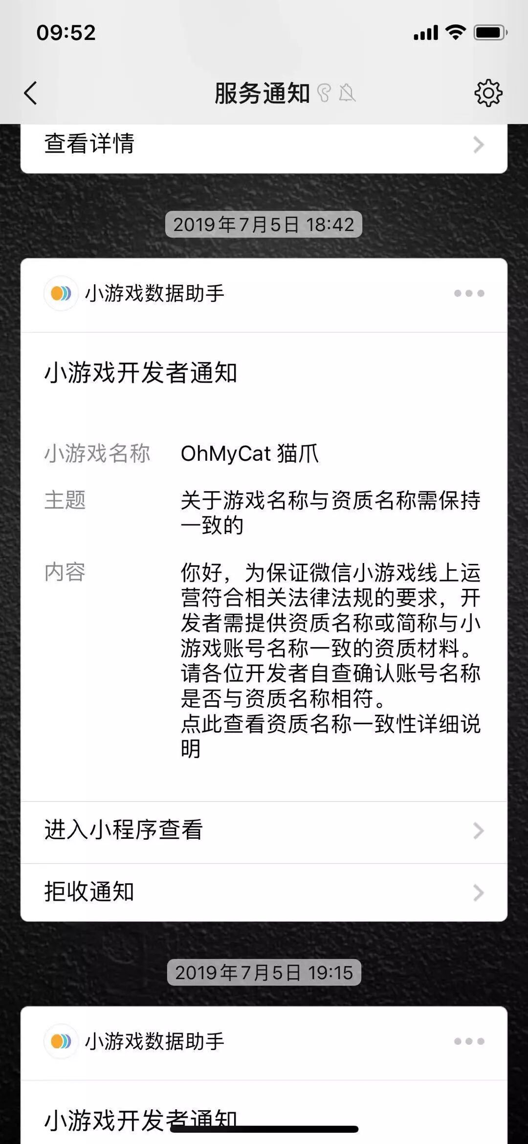 其中只有一条《关于游戏名称与资质名称需保持一致》(2019.07.05)发送的这条是和用户切身相关的,并且符合服务通知这个概念。(第一张图)
