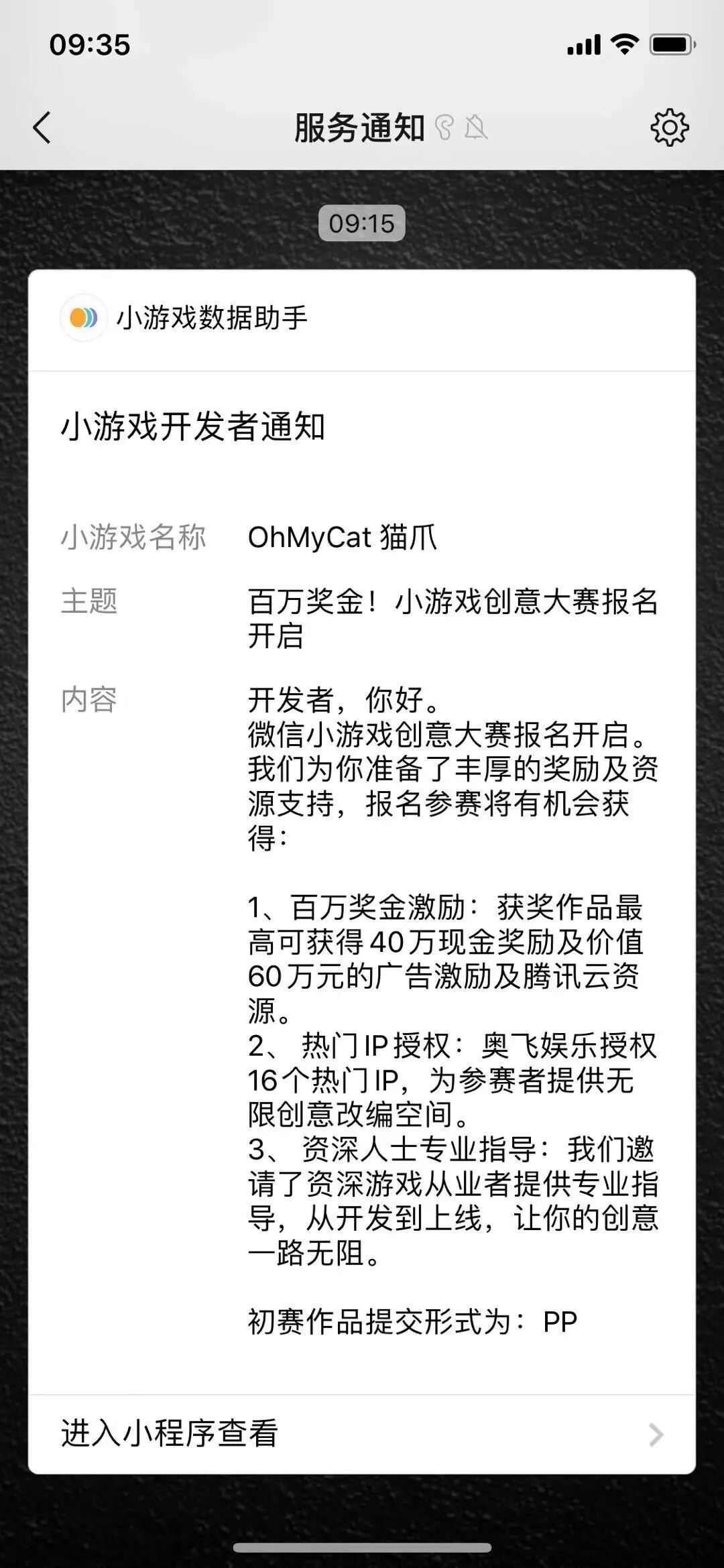 首先,来看一下你们的《小游戏数据助手》发送的《小游戏开发者通知》。