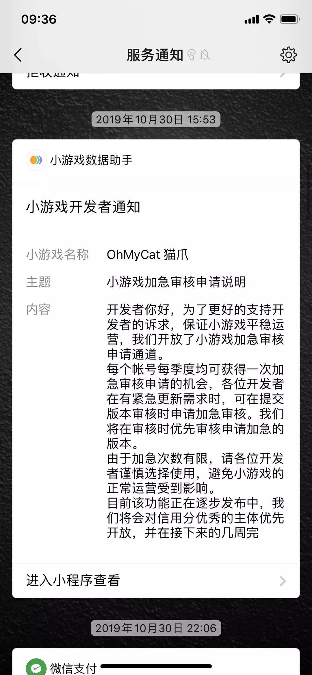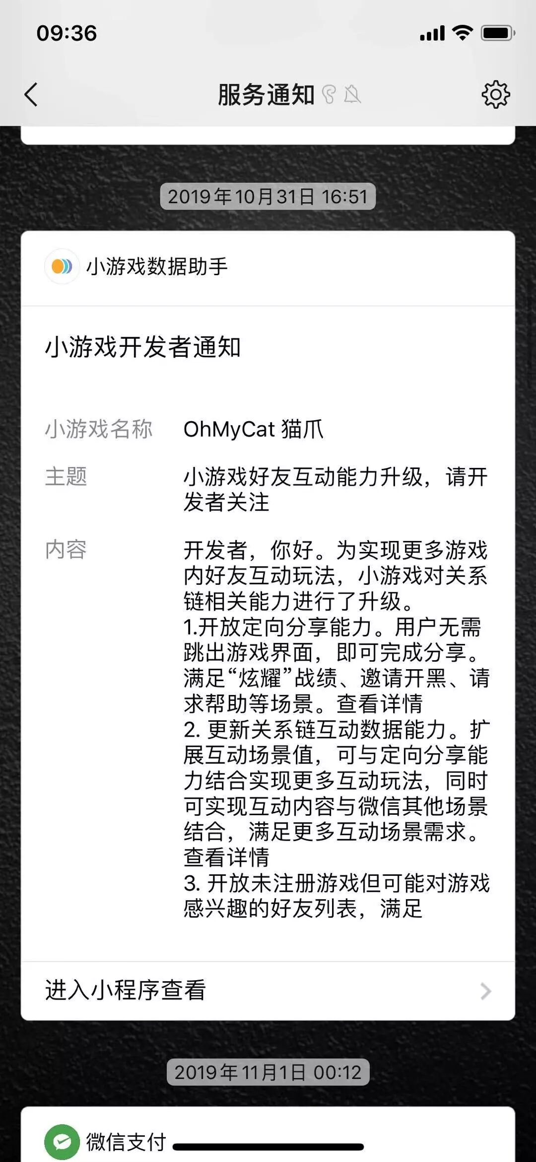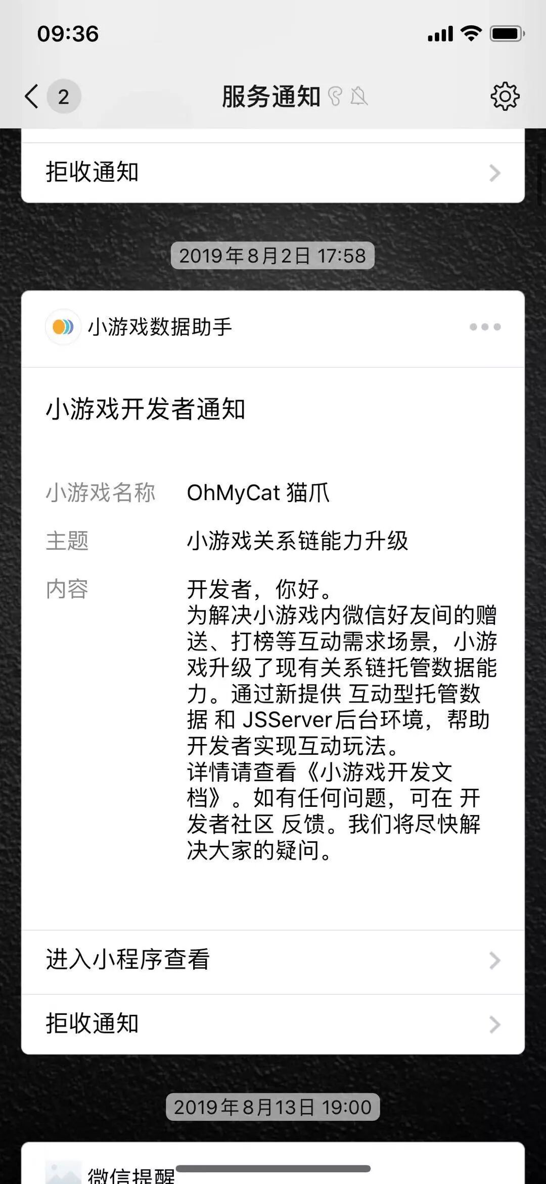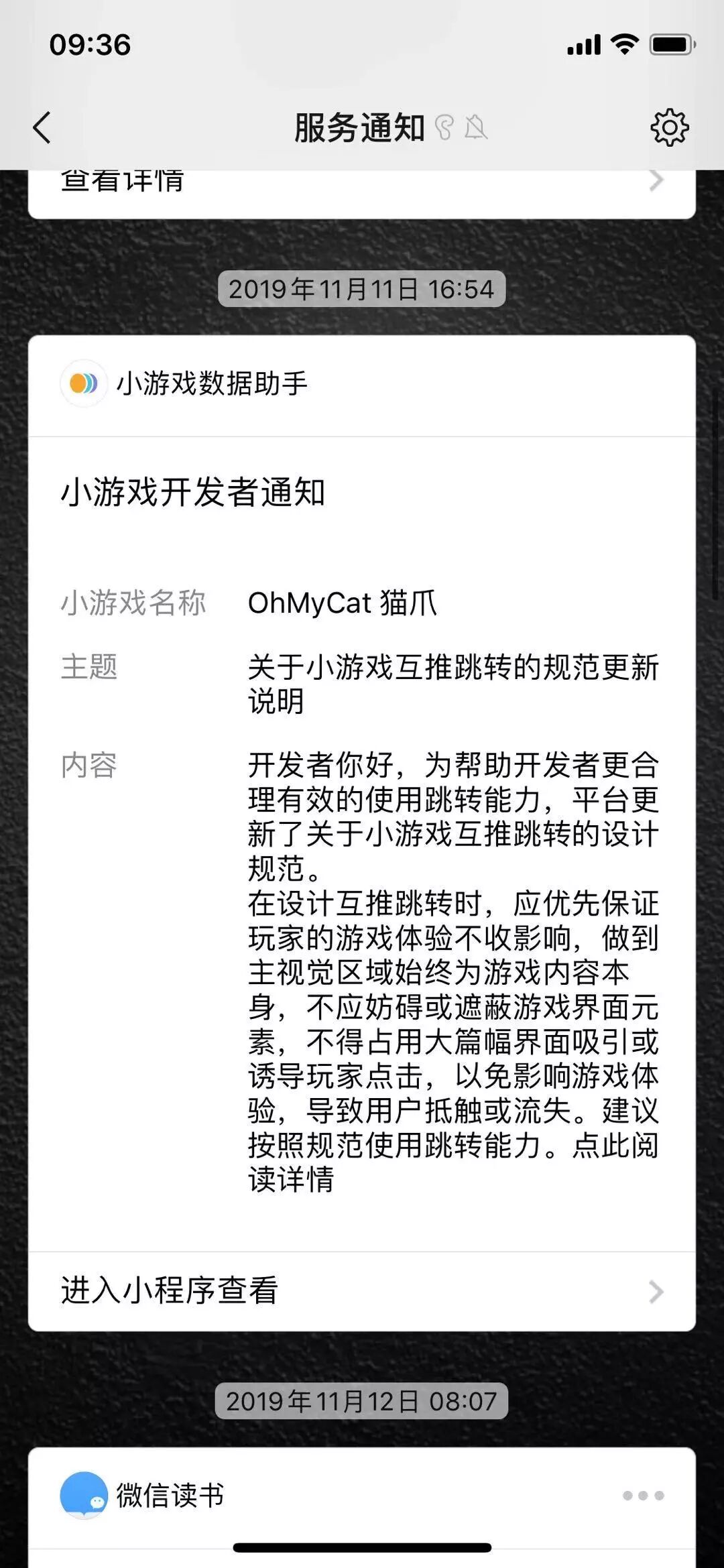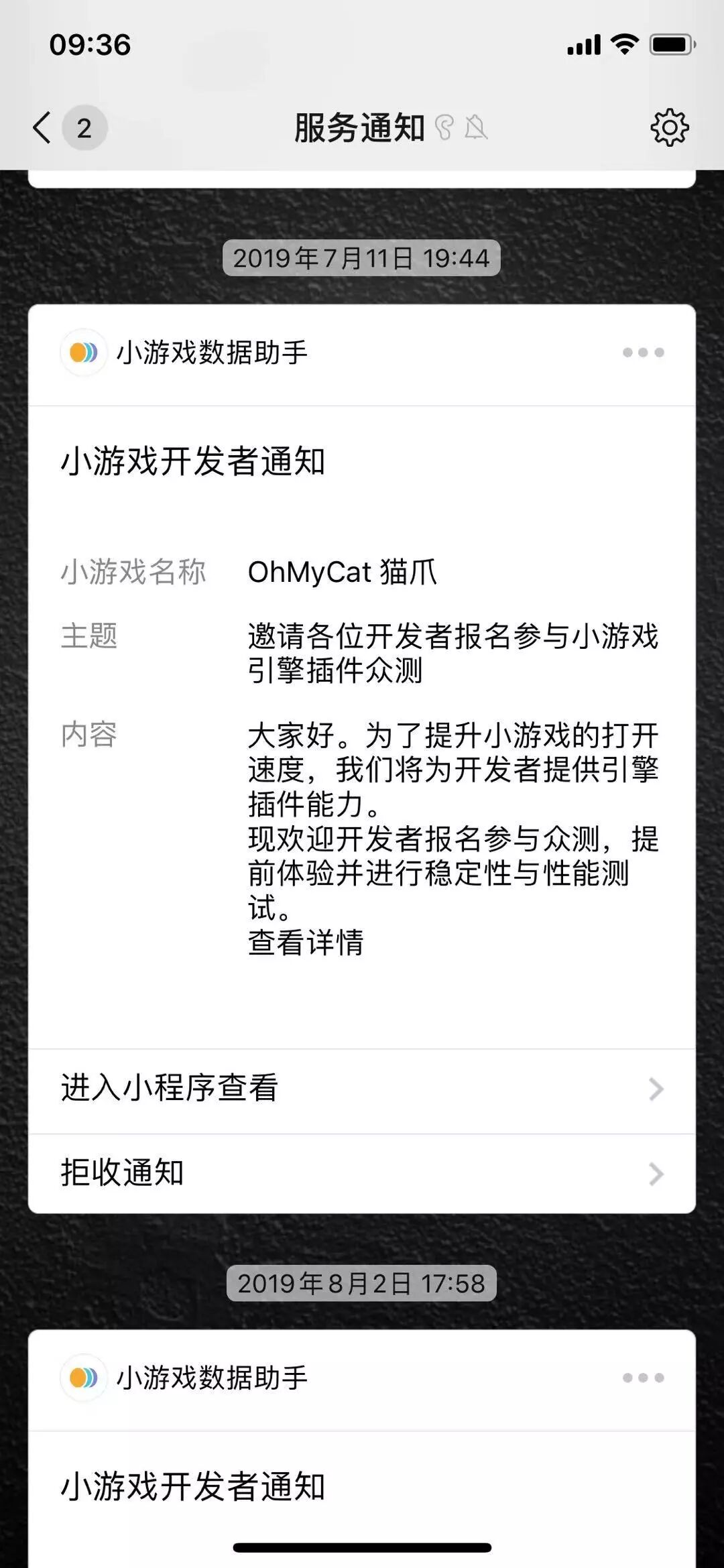 小游戏创意大赛报名、小游戏互推跳转规范、小游戏互动能力升级、小游戏加急审核申请、小游戏更新游戏对局回放、小游戏开发者调研、WeCare公益小游戏比赛、小游戏关系链能力升级、邀请参与引擎插件众测,是你们截至到 2019.07.11 的几条利用【服务通知】推送的一些消息。(后九张图)