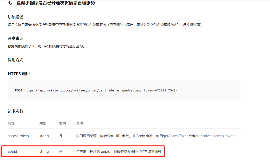 查看下接口文档:https://developers.weixin.qq.com/miniprogram/dev/platform-capabilities/business-capabilities/order-shipping/order-shipping.html#%E4%B8%83%E3%80%81%E6%9F%A5%E8%AF%A2%E5%B0%8F%E7%A8%8B%E5%BA%8F%E6%98%AF%E5%90%A6%E5%B7%B2%E5%BC%80%E9%80%9A%E5%8F%91%E8%B4%A7%E4%BF%A1%E6%81%AF%E7%AE%A1%E7%90%86%E6%9C%8D%E5%8A%A1