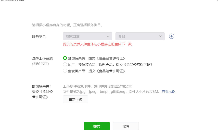 情况:小程序是做食品的,但是因为主体不一致,所以导致不通过,因为鳗鱼食品是其他公司进货的,没有食品许可证,有供应商的食品许可证,写了证明,但还是不通过类目审核,请问我应该怎么做呢?