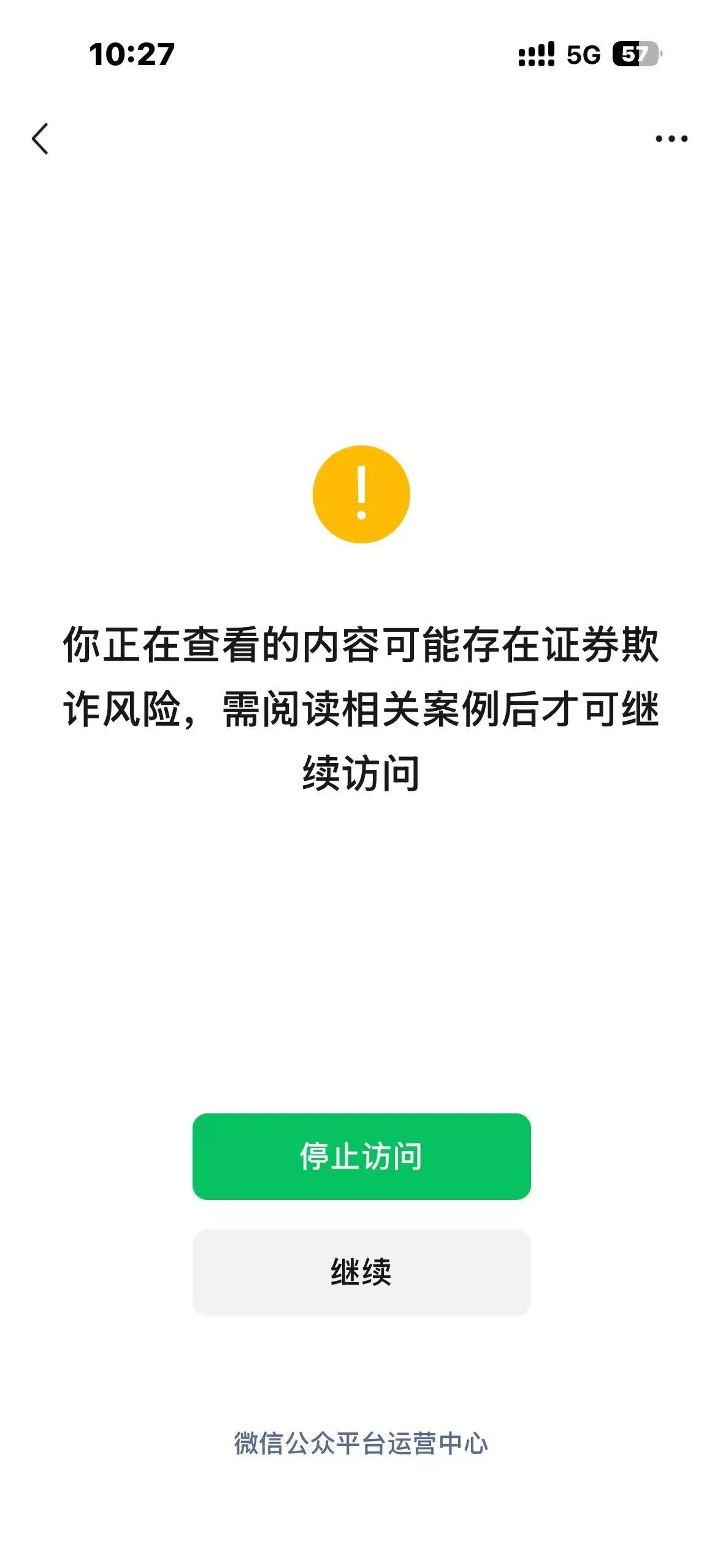 你好,我是这个公众号账号:13167261361的运营者,公众号名称是:财经小五,近期我发现我每次发文章第一次点击会出现证券欺诈提示,可是我的内容不存在欺诈行为呀,所以我现在怎么解决这个问题?而且我发现现在还限制了文章转发的功能,麻烦给我提供下解决方案,谢谢!这太影响我文章的数据了!请尽快解决谢谢!并没有收到任何违规处罚通知,无缘无故就出现了这个提醒和受限转发功能!