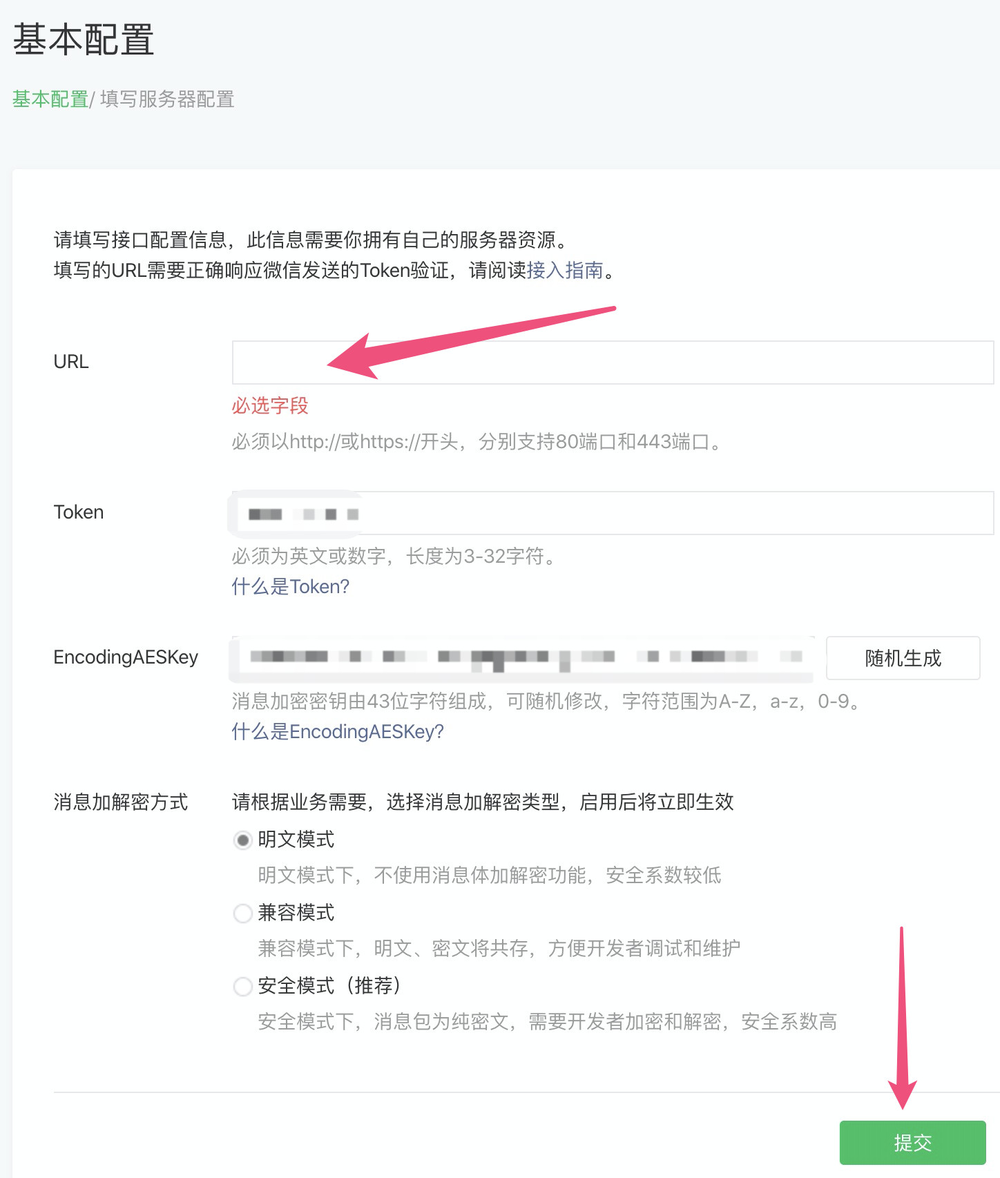 开发 -> 基本配置 -> 服务器配置 -> 修改配置 -> URL,然后填写外网 URL,后的“提交”按钮。