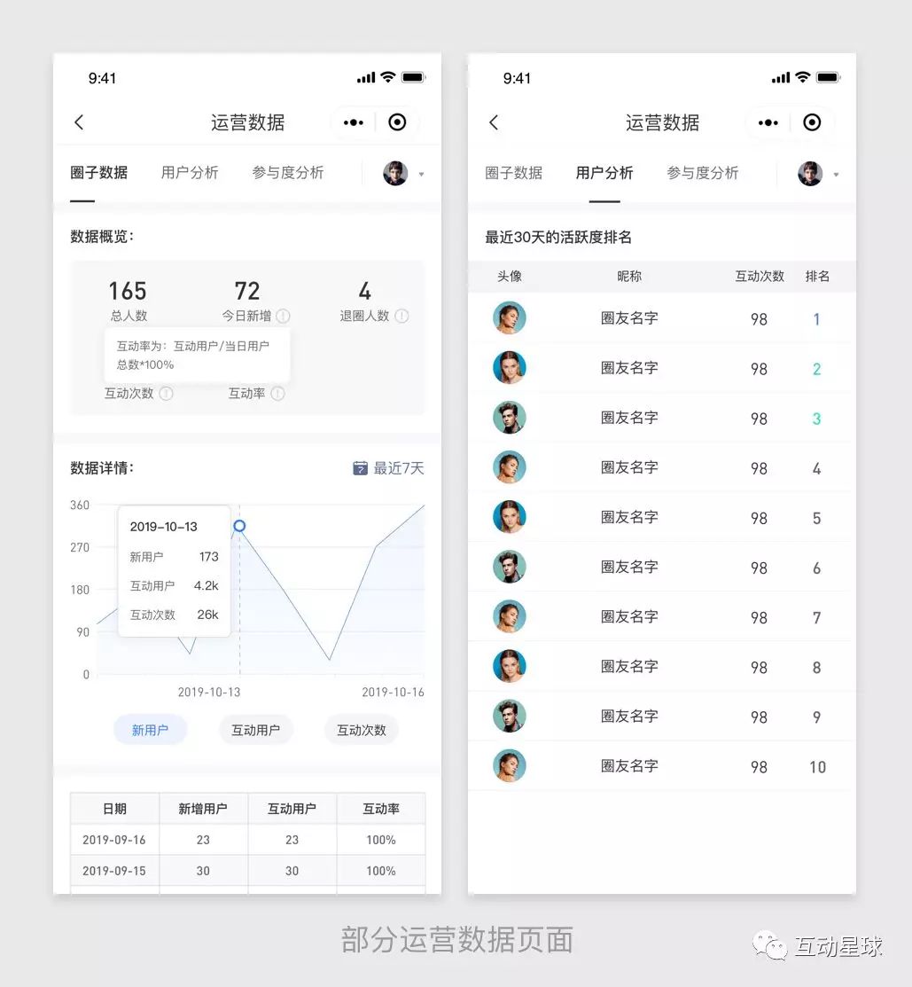 互动星球拥有超详细的数据分析功能,可实时统计圈子后台数据,链接事件与数据,活跃情况、活跃度、参与活动情况等数据情况,都可一目了然进行查看。圈子运营者们可根据实时回馈的数据情况,来进行合适的圈子运营规划调整。