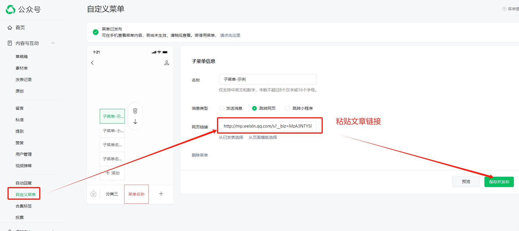 跪求啊,第一次做公众号需要大神指教,怎么样将公众号推文放到自定义菜单里面啊?