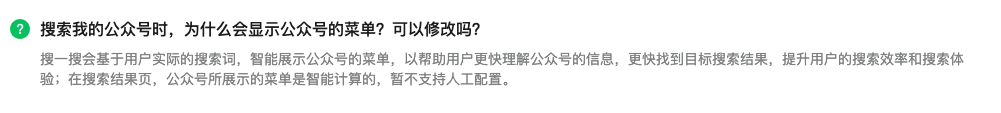 搜一搜会基于用户实际的搜索词,智能展示公众号的菜单,以帮助用户更快理解公众号的信息,更快找到目标搜索结果,提升用户的搜索效率和搜索体验;在搜索结果页,公众号所展示的菜单是智能计算的,暂不支持人工配置。