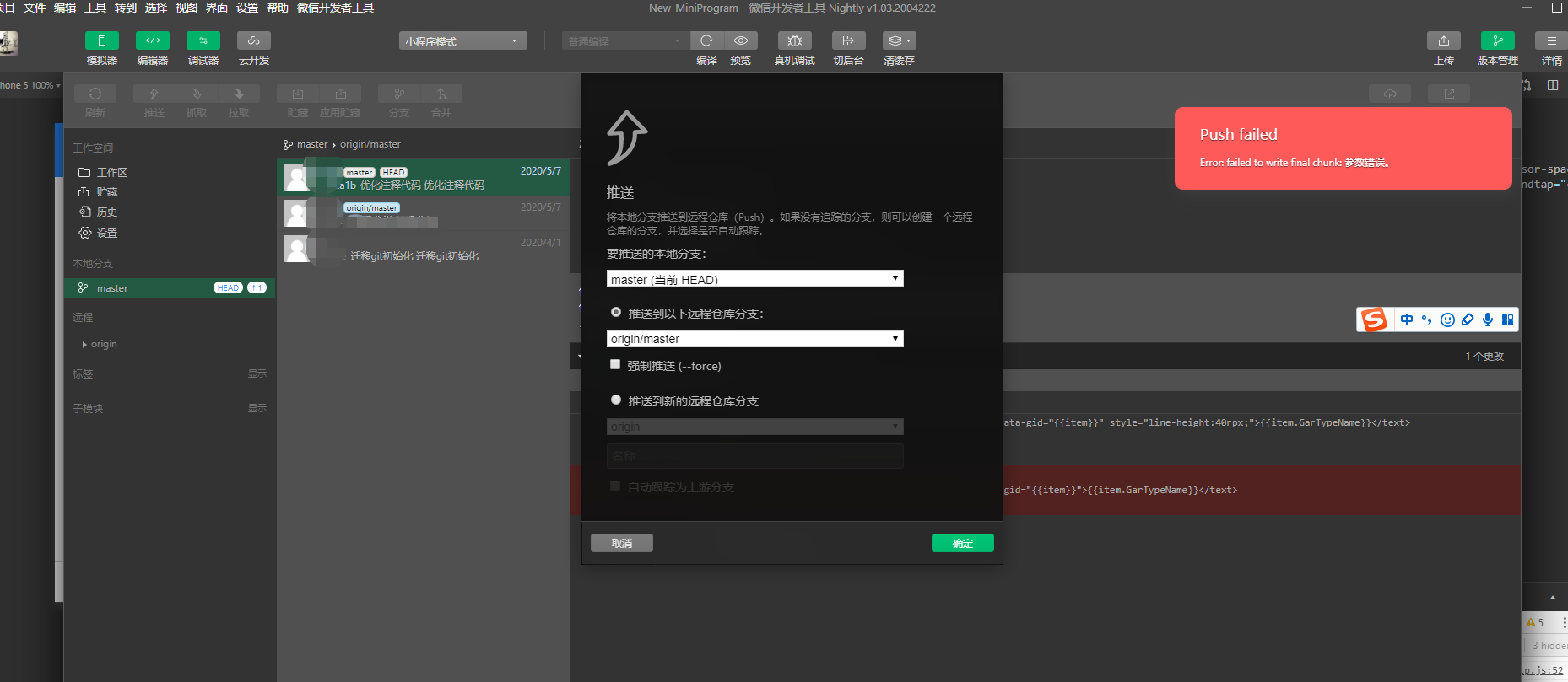这一次代码迁移后换了git的地址 我从新的地址检出代码之后,等我本地有改动的时候,提交到本地分支没有问题,然后本地分支推送到远程仓库分支的时候,就会报这个错误failed to write final chunk:参数错误。勾选强制推送也是报这个错。但是我在代码所在目录用命令行推送的话就可以正常推送 。