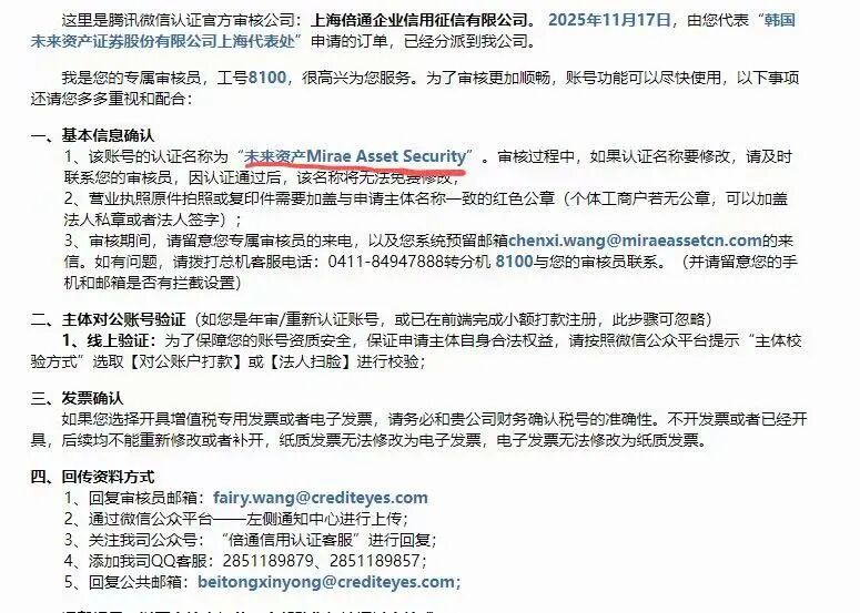 我服务号内11月17日首次提交的名字是‘未来资产Mirae Asset Security’ (图1 邮件认证信息为证)