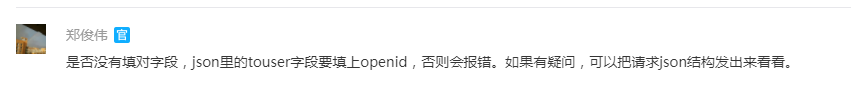 是否没有填对字段,json里的touser字段要填上openid,否则会报错。如果有疑问,可以把请求json结构发出来看看。