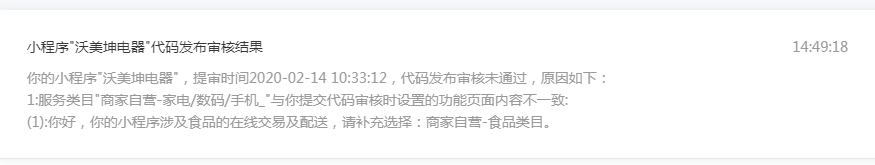 你好,经核实,你的小程序涉及食品的在线交易及配送,请补充选择:商家自营-食品类目。或自查代码,确保包括前端展示、小程序代码等整体均移除:食品内容,再提交代码审核。
