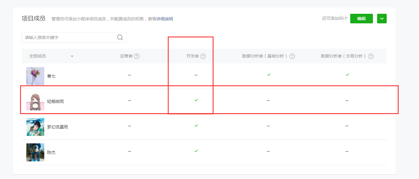 但是我们的微信开发者工具页面没有绑定微信开发者这个操作选项:如图成员管理里面给我添加了开发者权限,但是在web微信开发者工具里面还是无法预览。