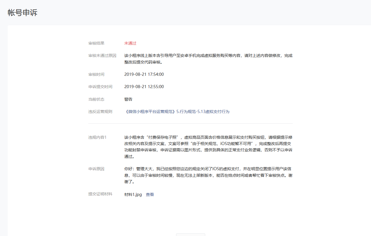 由于涉及IOS虚拟支付,第一次由于是体验版本提交的申诉不通过(正式版本未上线)申诉的,那时候还没有新版本审核完成就申诉了,等审核完成后我想在申诉一次,可以找不到入口了。请问如何第二次申诉?或者说不需要在申诉了直接等官方审核就可以?谢谢。我已经关闭了IOS虚拟支付在正式版本并已经发布,请管理大大查看。