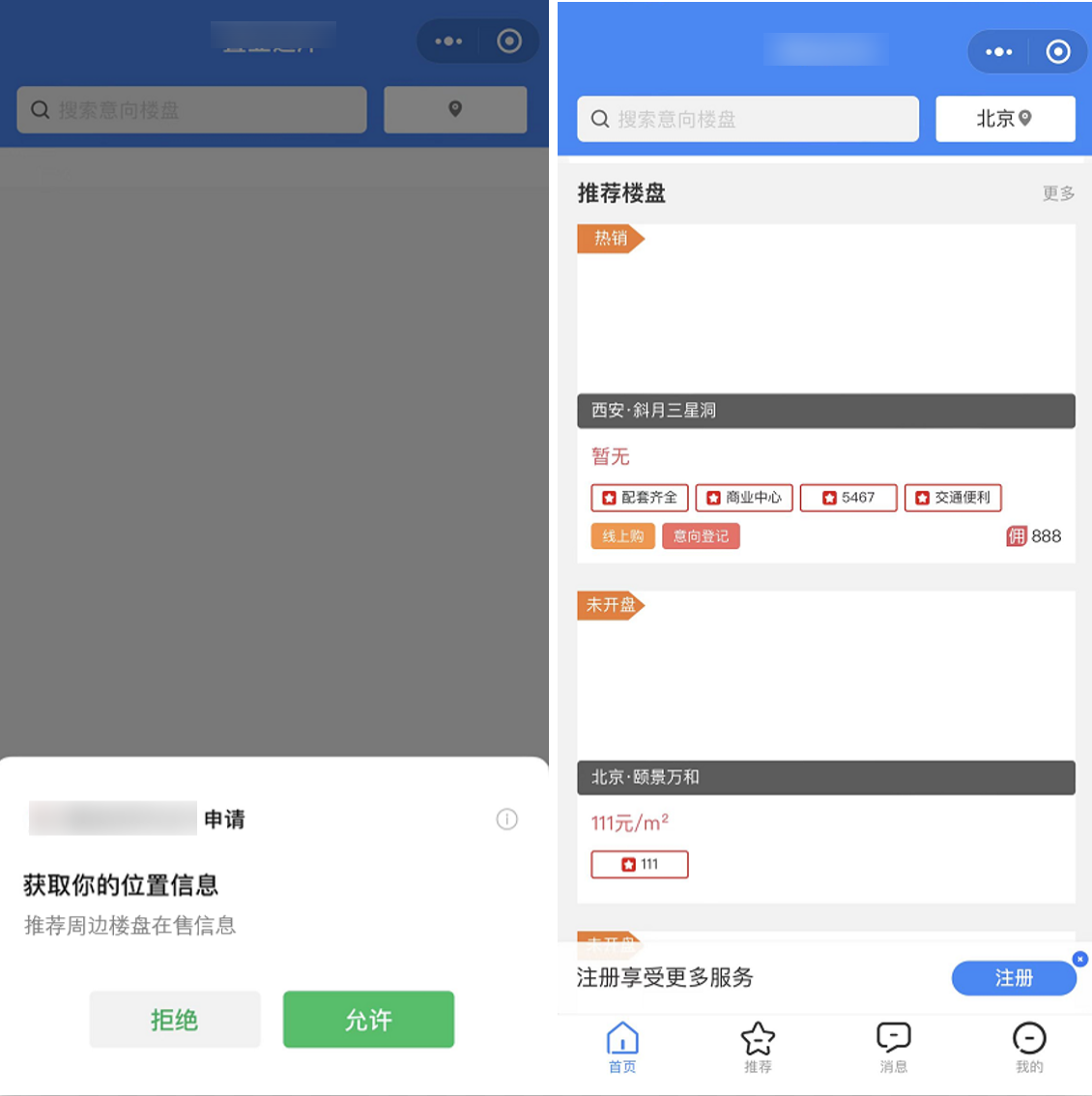 5)房地产、餐饮、商家自营等小程序,希望申请wx.getLocation接口获取用户当前实时位置信息,为用户展示附近、周边门店信息,提供推荐营销服务,且小程序内未提供线下门店导航服务,仅在小程序内为用户提供附近、周边门店信息展示服务,该场景不支持使用wx.getLocation、wx.onLocationchange这类高精度位置接口,建议开发者使用wx.getFuzzylocation、wx.chooseLocation或wx.choosePoi实现上述场景。