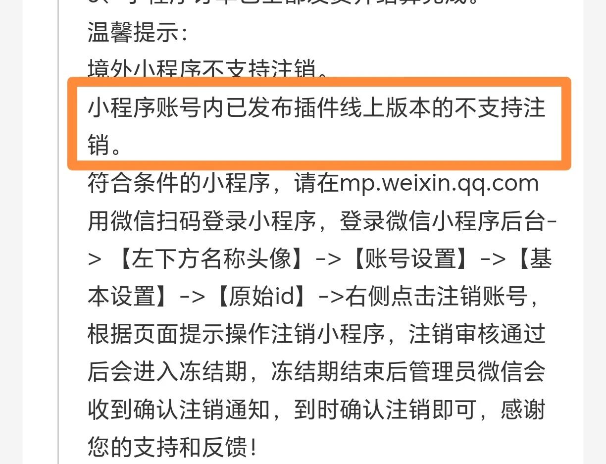 小程序注销时提示:“小程序账号内已发布插件线上版本的不支持注销”,请问已添加了直播组件插件,但不能删除,小程序能否可以注销?