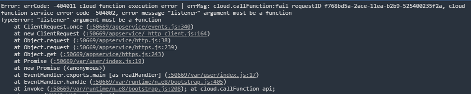 exports.main = async (event, context) => { var option = { headers: { 'Accept': '*/*', 'Accept-Encoding': 'utf-8', 'Accept-Language': 'zh-CN,zh;q=0.8', 'Connection': 'keep-alive', 'user-agent': 'Mozilla/5.0 (Linux; Android 5.0; SM-G900P Build/LRX21T) AppleWebKit/537.36 (KHTML, like Gecko) Chrome/78.0.3904.97 Mobile Safari/537.36', } }; return await new Promise((resolve, reject) => { try { https.get(event.url, option, (res) => { var contont = '', location = res.headers.location res.on('data', (chunk) => { contont += chunk }); res.on('end', () => { resolve({location,contont}) }); }).on('error', (e) => { reject(e) }); } catch (e) { reject(e) } }) }至少先调通一个最简单的云函数吧?然后再慢慢添加代码。