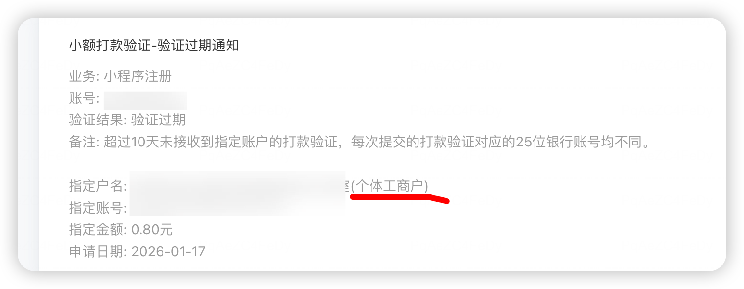 麻烦看下啥原因哦。。。是不是因为我这边的户名中有"(个体工商户)",在小程序注册时他貌似把我户名中的中文括号自动改成了英文括号导致验证失败?