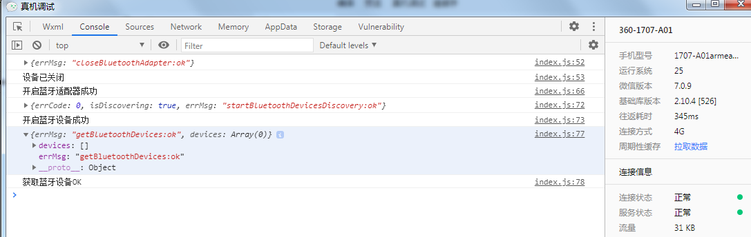 这个是我的手机在调用方法wx.getBluetoothDevices获取蓝牙热敏打印机时得到的数据,怎么都获取不到设备,几天前还能正常获取,但是突然就变这样了,我保证我的手机是没问题的,因为我用热敏打印机提供的app,是可以正常连接到打印机打印的。
