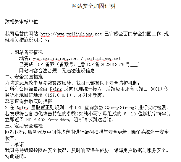 您好,尊敬的官方。我们的链接域名被限制了,域名已在官方备案。这个链接我们一直在用 ,现在没办法进行访问了。我司域名被他人恶意拼接参数(如?mhxmxaw)用于违规推广,我方已清理并加固网站,主站内容合法合规,请解除限制。希望官方解除限制 http://www.mailiuliang.net/frontApi这是我们的链接。非常感谢,我们积极配合官方进行整改。