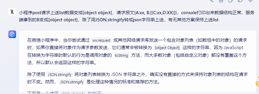 小程序post请求上送list数据变成[object object],请求报文{A:xx, B:[{C:xx,D:XX}]},console打印出来数据结构正常,服务端拿到的B变成[object object],除了用JSON.stringify转成json字符串上送,有无其他方案保持上送list?