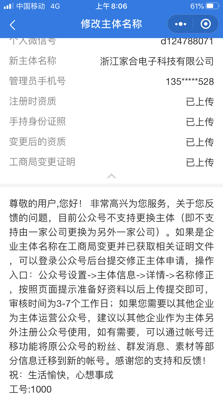 公司营业执照更名了,营业执照编号没变的,在交流社区里面查询了,按小程序主体更名步骤提交了工单,结果工单的回复牛头不对马嘴的,怎么办?我只是想要小程序主体更名啊,不是公众号更换主体啊,小程序后台压根就没主体更名的地方