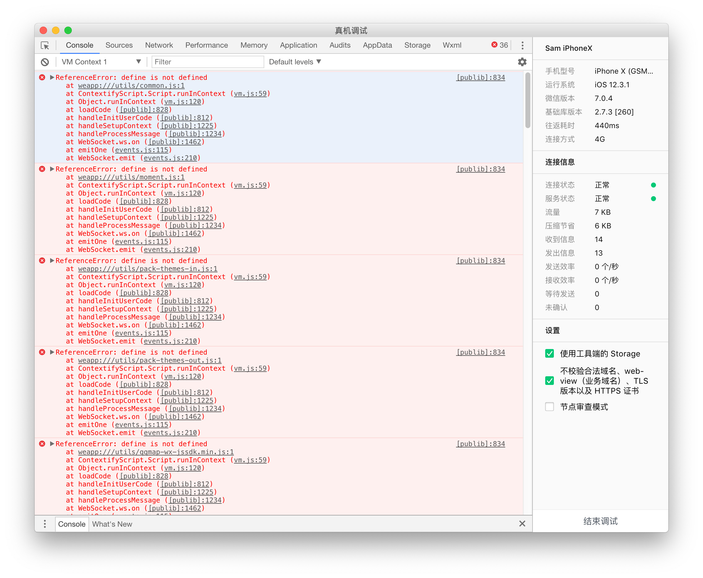 之前iphonex真机调试都正常的,今天调试的时候出现这个问题,换了安卓的一台手机真机调试正常。开发者工具下调试正常。