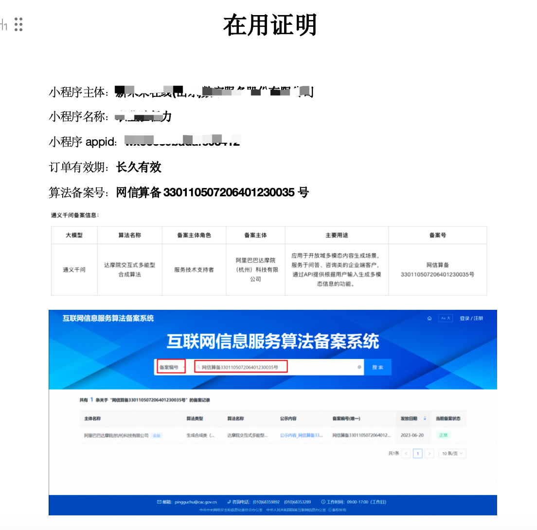 有谁通过了,给个正确的《在用证明》说下,现在使用的是阿里云的通义千问。