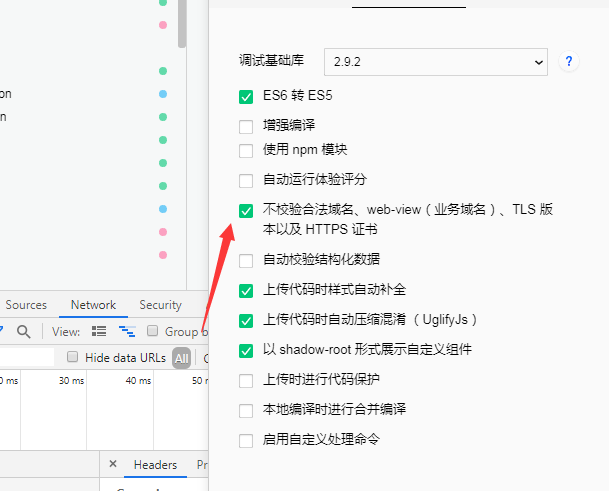 第一,项目设置这里只是对工具生效;第二,手机预览,请打开右上角三个点里的开发调试;第三,真机预览,预览的调试面板单独勾选不校验。大概就是这么几种情况