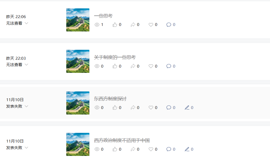 我想发布一篇中国适合实行中央集权,不适合实行西方政治制度的文章,但是公众号审核说违法了法律法规政策,我就想问到底违反了什么法律法规?我爱国所以才会写出这篇文章,因为很多人盲目认为西方好,我是在引导国人对西方要有一个理性的认识。怎么tmd就违反法律了?难道爱国也有错?如果违反了法律到底是违反了哪条法律?我的哪一段违反的法律?中国还有言论自由吗?