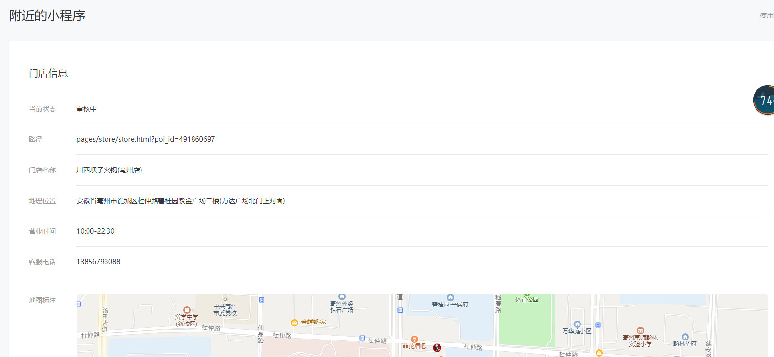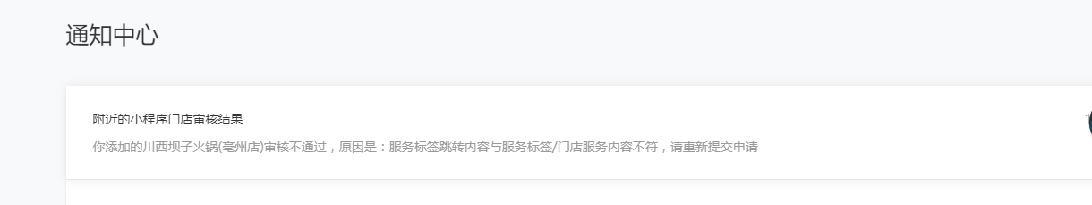 你好,贵司提交的门店小程序有一次不通过记录,不通过原因是您提交的门店小程序的“点餐"服务标签的路径跳转内容打开为小程序首页,与服务标签“点餐"不相符。由于服务标签关联的路径的服务落地页需要与服务标签保持一致,建议找到在填写服务标签路径的位置找到对应的页面获取路径, 比如“点餐”到用户下单点餐的页面获取 、”预订“ 到用户下单的页面获取路径、”优惠“ 到用户领取优惠的页面获取路径等等。关于服务标签请参考“附近的小程序使用指南”内的“添加服务功能"资料:http://kf.qq.com/faq/170401MbUnim17040122m2qY.html