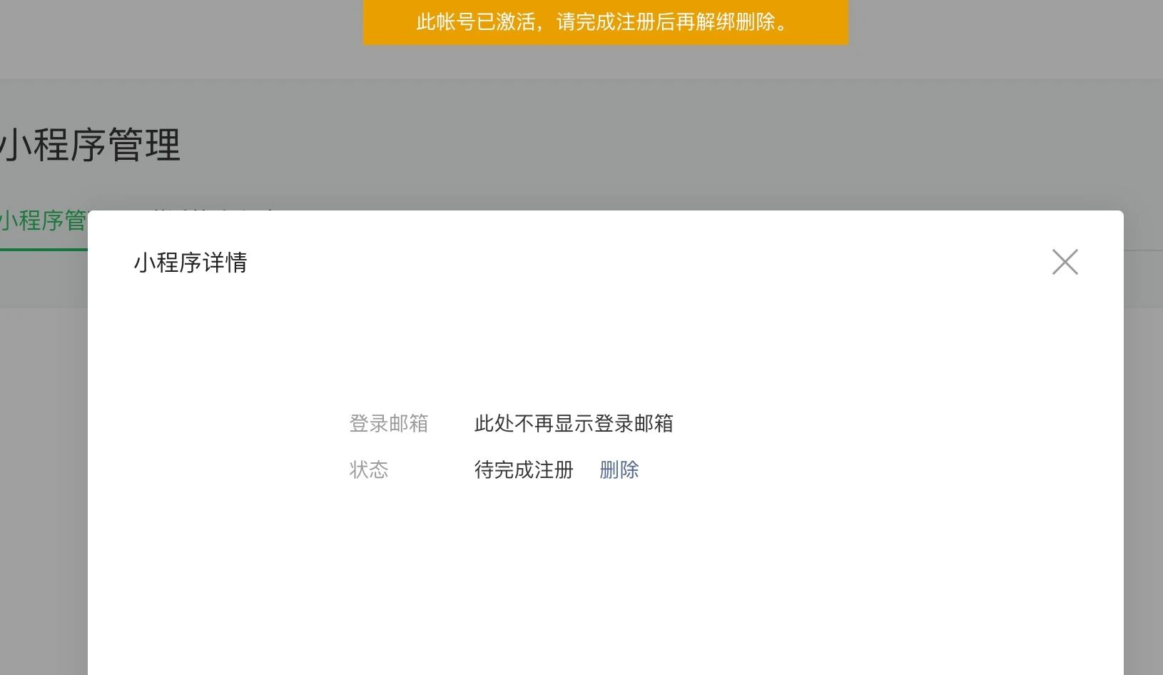 我也是这个状态,怎么处理?我前面是在添加小程序时已经做了邮箱激活,结果返回,却是这个“待完成注册”状态。