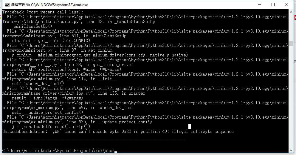 def _get_sdk_version(self): # read from project.config.json if self.project_path and os.path.isfile( os.path.join(self.project_path, "project.config.json") ): with open(os.path.join(self.project_path, "project.config.json"), "r") as fd: self.sdk_version = json.loads(fd.read().strip()).get("libVersion", None) 点击报错的的位置,将wx_minium.py文件的该行代码 with open(os.path.join(self.project_path, "project.config.json"), "r") as fd:的读取模式修改为"rb"试一下。遇到同样的问题,请问解决了吗