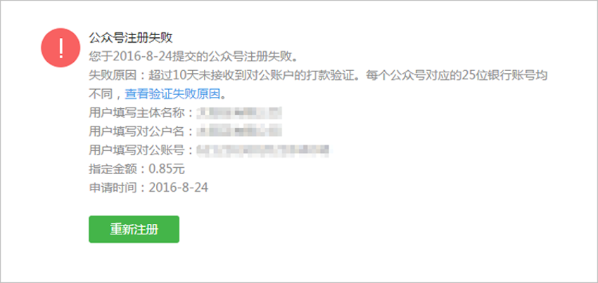您需要在注册提交后10天内完成打款验证,否则将超时验证失败,请您登录公众号重新登记信息提交注册。
