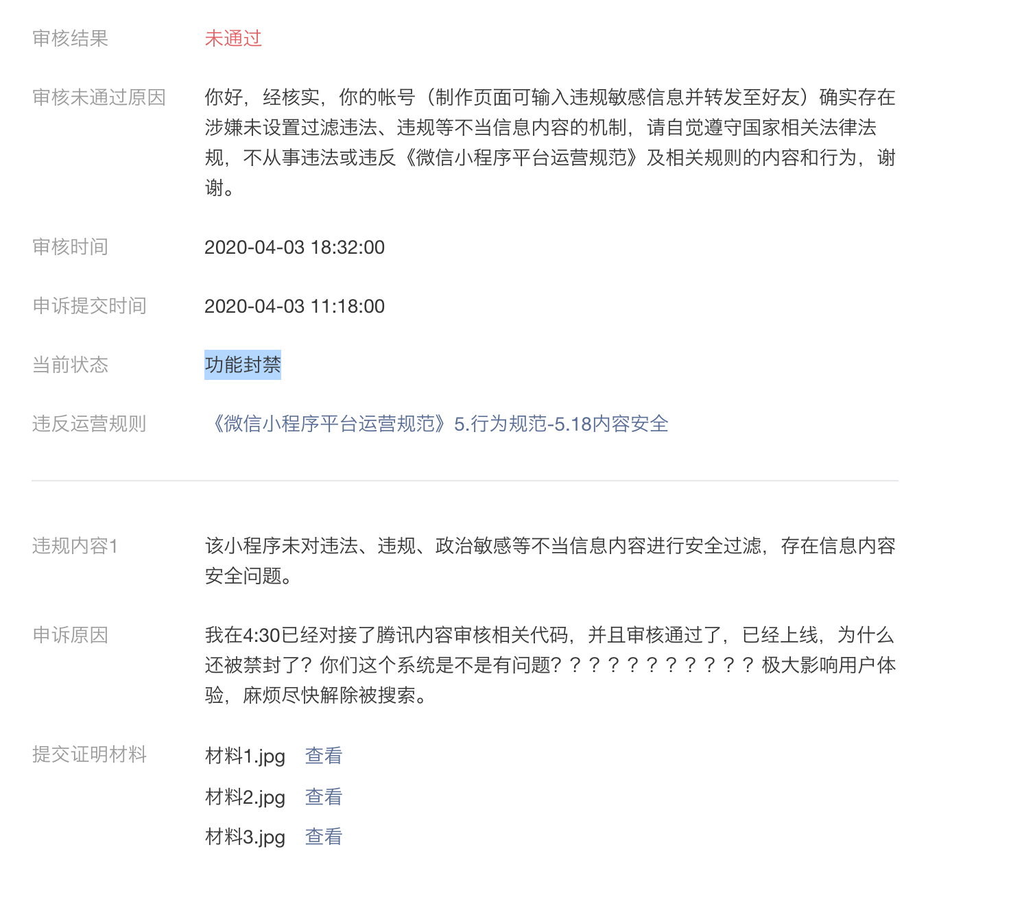 为什么还是被禁封?而且申诉完全不看我说了什么内容,小程序审核也太随意了吧。