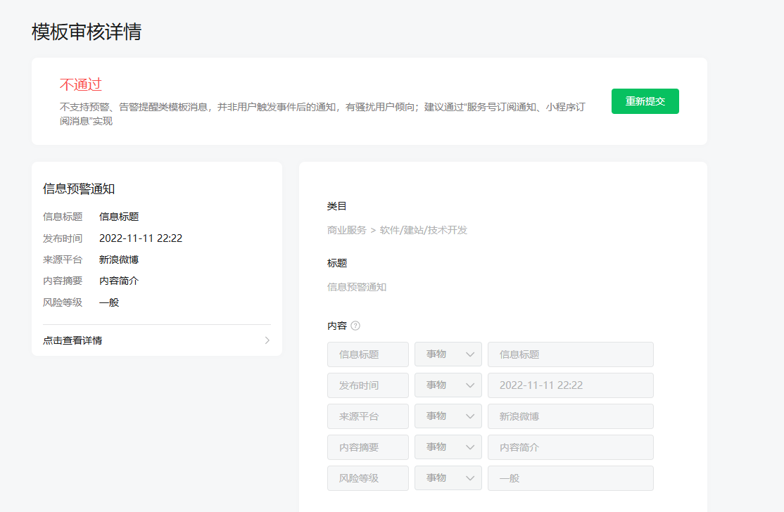 你好,1、类目模板申请审核会评估模板的内容和使用场景是否合理,并非所有模板都能准入,对于存在骚扰、营销、滥用倾向的场景不支持入库;