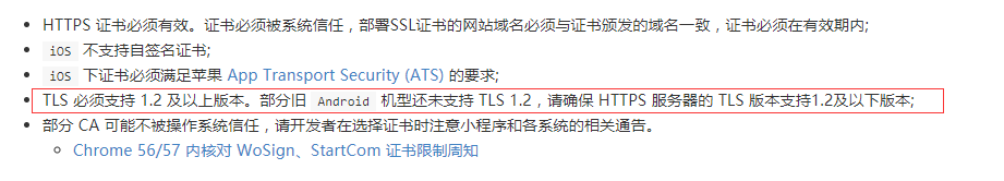 谢谢您的回复,但是据官方给出的API(wx.request)只能支持tls1.2版本,那么这不是互相矛盾吗?部分旧机型还未支持tls1.2(也就是部分android5.0以下版本手机)需要用到tls1.2以下版本,而API只能用TLS1.2版本,这个不矛盾吗?