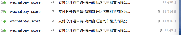 提交支付分的邮件申请已经半个多月了,其中多次申请,没有回复任何邮件告知我是否通过。我的申请到底是什么状态,我也无法得知。发送邮件的邮箱是wuchuheng@163.com。 商户号是: 1604001481。 行不行还请官方给个准信,这样僵持很不好。谢谢。