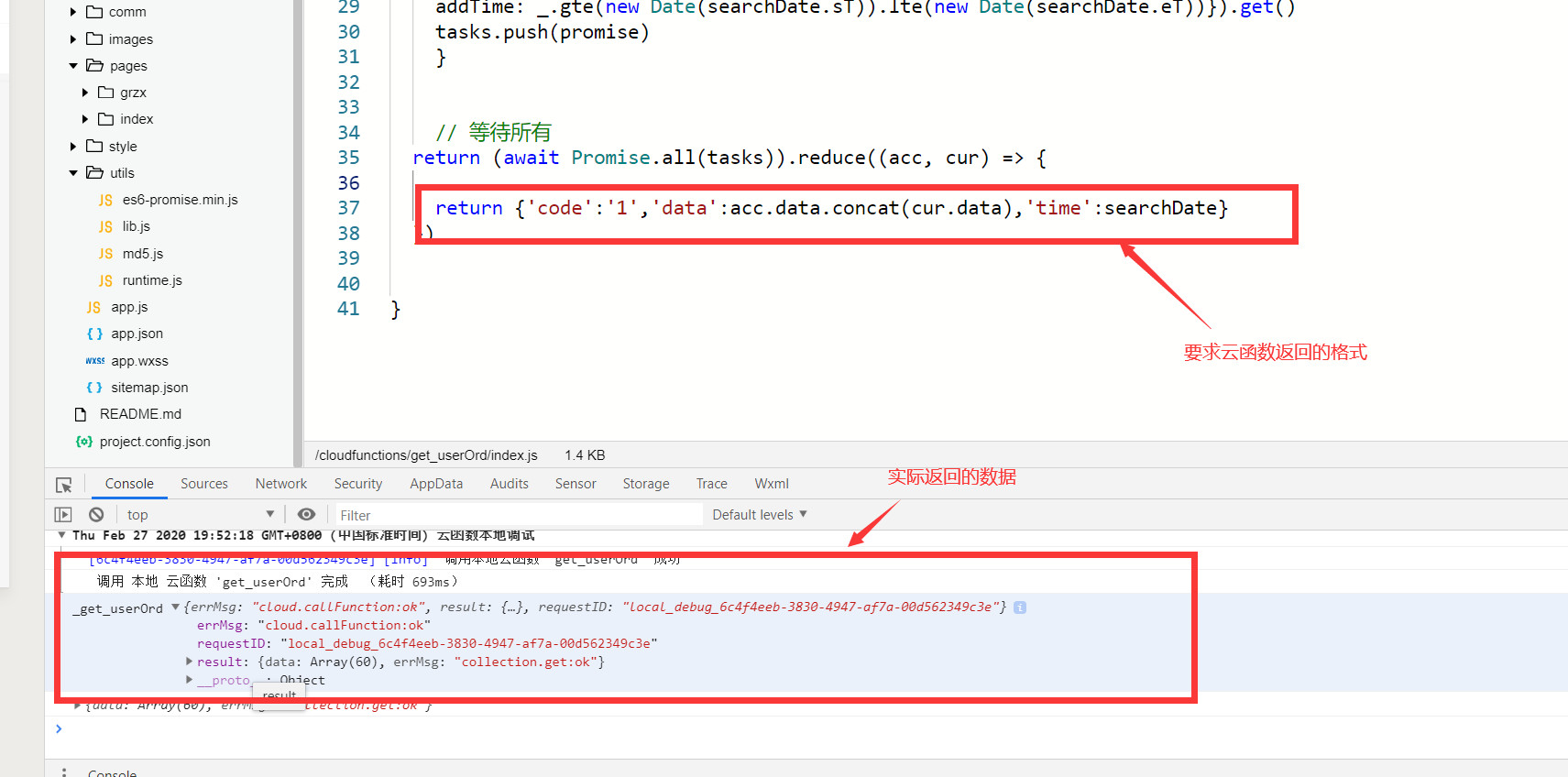 按要求云函数返回的是一个对象;格式为{'code':'1','data':acc.data.concat(cur.data),'time':searchDate}
