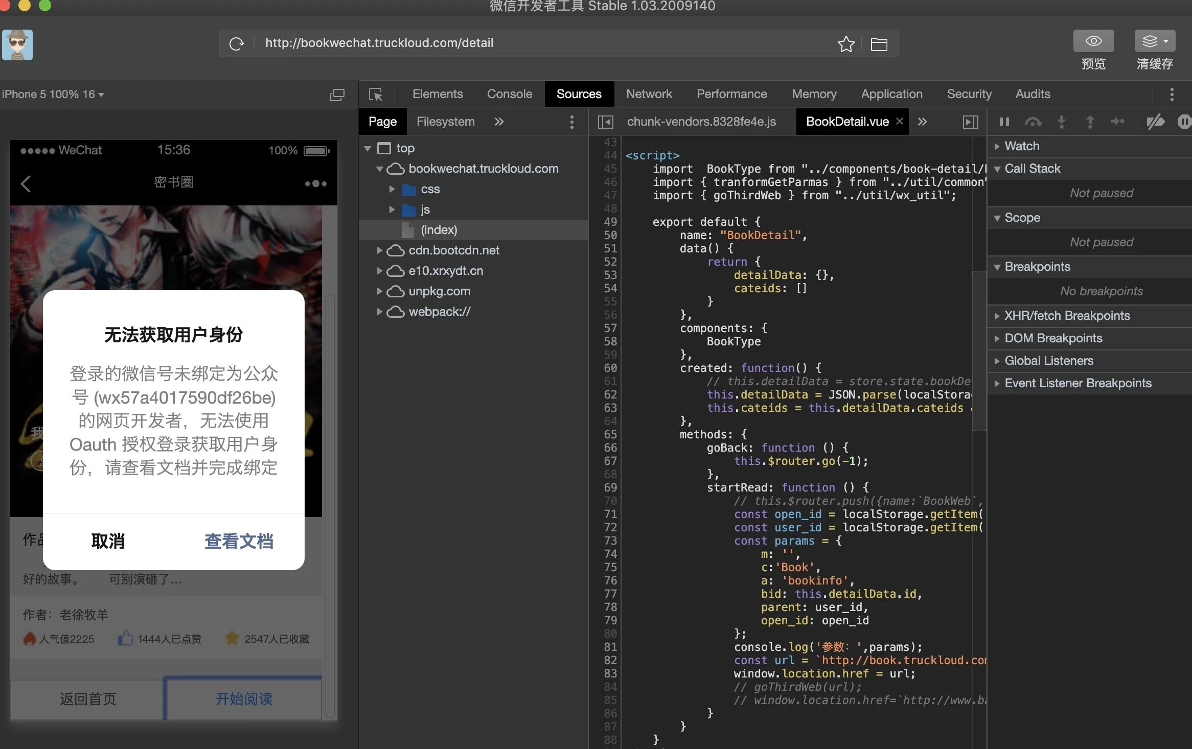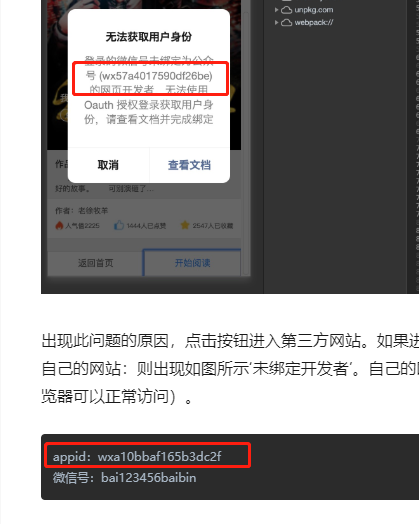 出现此问题的原因,点击按钮进入第三方网站。如果进入http://www.baidu.com则没有问题。但是进入自己的网站:则出现如图所示‘未绑定开发者’。自己的网站url:http://book.truckloud.com(网站在浏览器可以正常访问)。