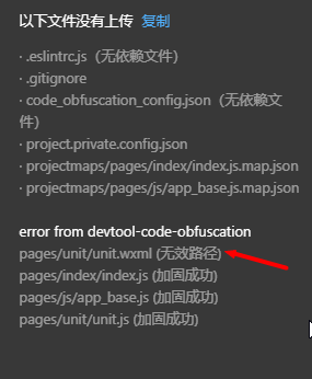 下图箭头可以看到,.js文件加固成功,.wxml文件就是无效路径。