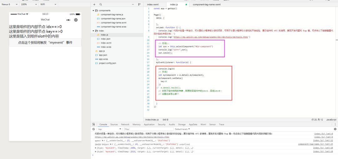 在爸的 wxml里 给组件一个id(比如 heihei),在爸的onLoad里调用 let son = this.selectComponent("#heihei")。比如组件里定义了一个方法 test(),可以用 son.test() 来调用