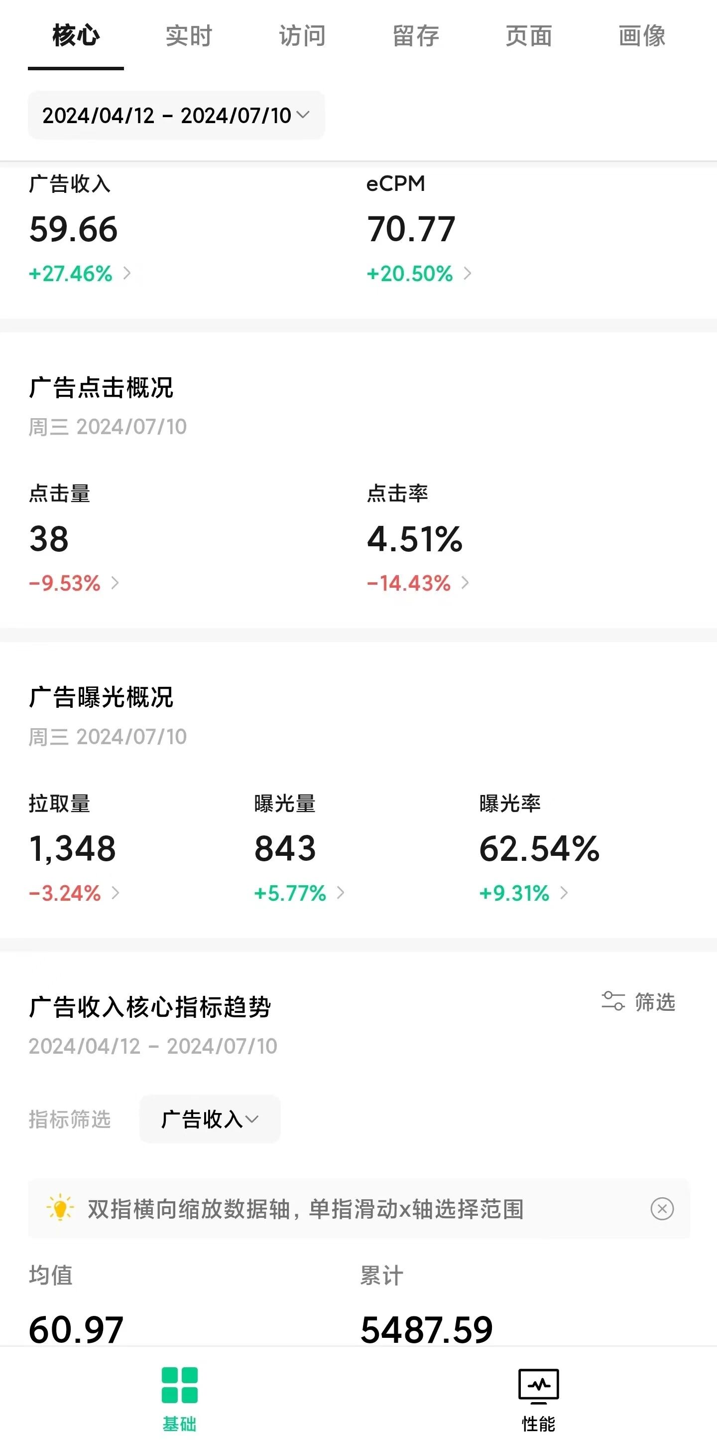 用户数据很漂亮。可以把各种广告都尝试一遍,保留投放ecpm比较高的广告。原生模板广告和banner真是一言难尽。ecpm低的可怜。视频广告可能还稍微高一些