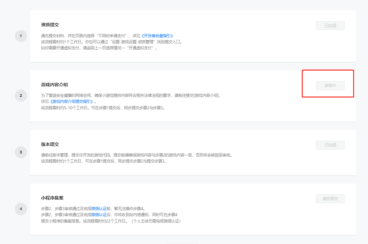小程序代码审核通过了,小程序备案步骤2游戏内容介绍通知中心也提示通过审核了。可是审核页面一直显示审核中,无法进行下一步该怎么办?十万火急,卡了很久了,拜托拜托帮帮忙