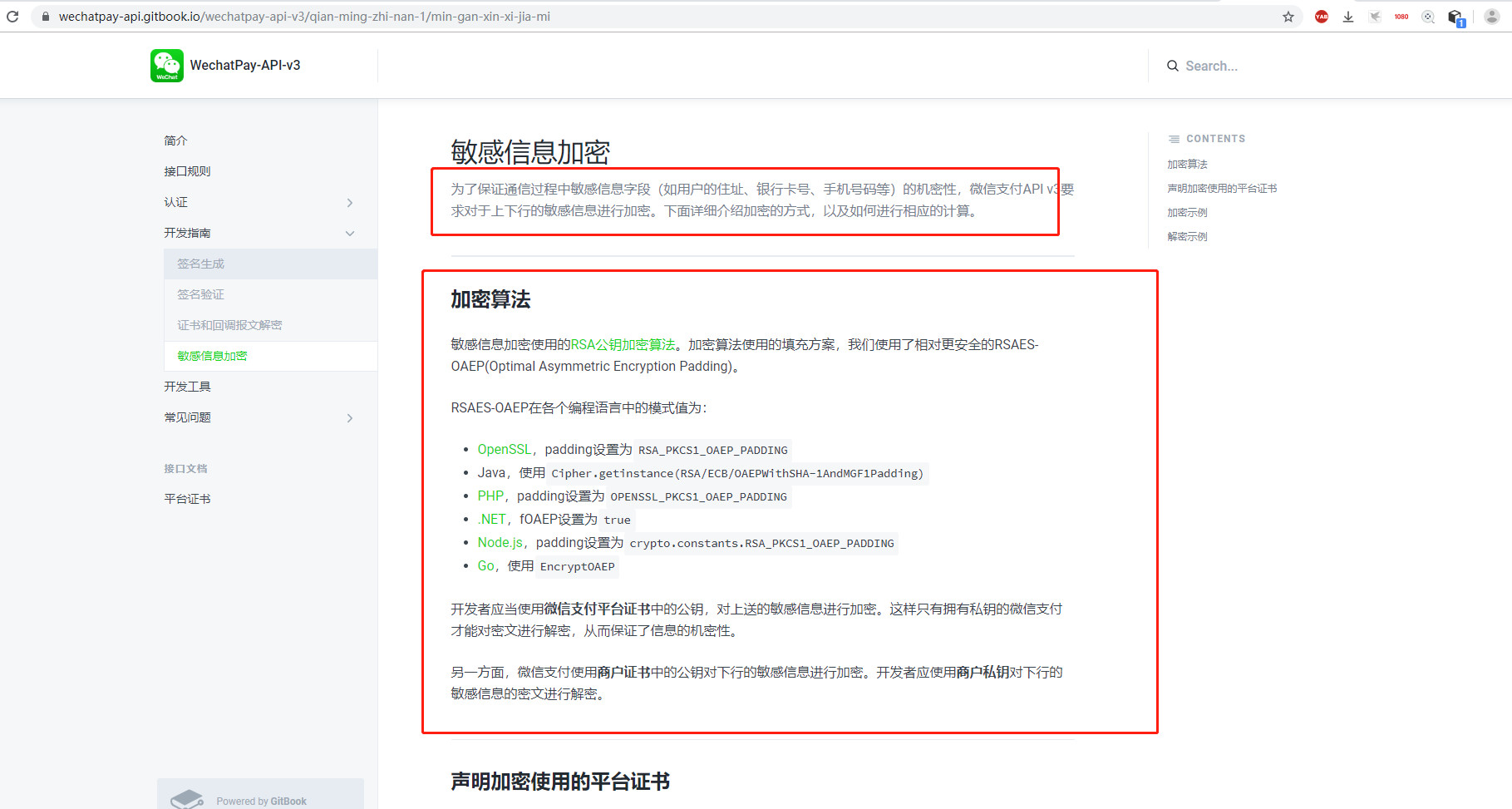 如果直接使用对应接口例子参数,也会出现这种错误,这里可以检查下请求参数,对应的请求参数如果存在敏感信息,需要通过平台证书进行加密,https://wechatpay-api.gitbook.io/wechatpay-api-v3/qian-ming-zhi-nan-1/min-gan-xin-xi-jia-mi